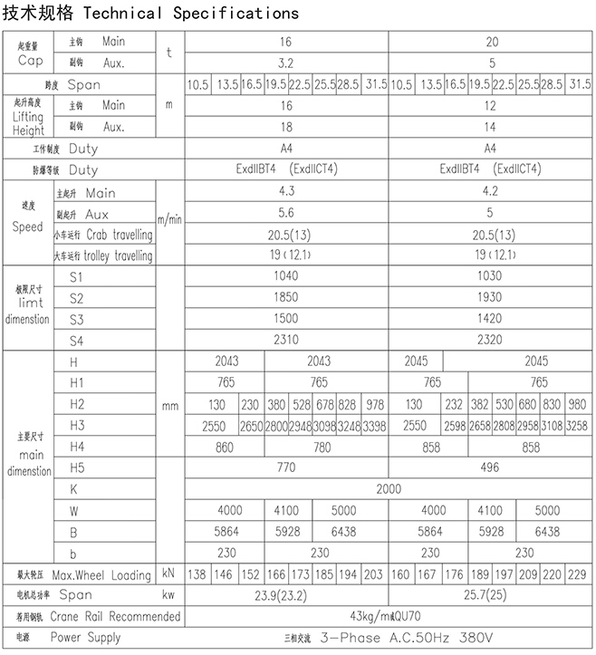 QB型16、3.2~20、5t防爆吊钩桥式起重机